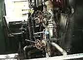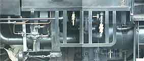 ![]() 中央のロッドはドレン操作用のロッド。その下に見える配管はレール水まき管。上下に走る配管は砂撒き管。 |