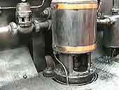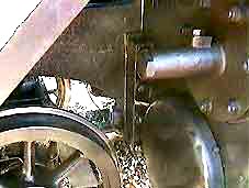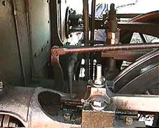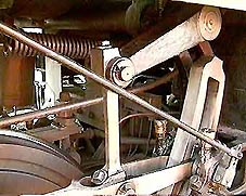 ![]() 斜めに走るロッドはオイルポンプ作動ロッド。左右の逆転リンクを結ぶ太いロッドが一直線なのが解ります。バネはその復元バネです。中央を横に走る丸ロッドはドレン操作ロッド。 |