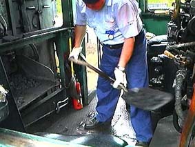 焚口が開くと赤い炎の光が機関助手のおじさんの体を赤く照らします(>0<)/熱い〜! |