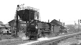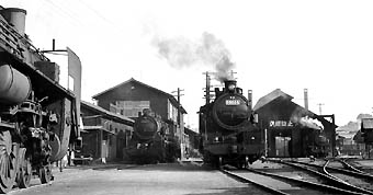 一番手前が日田彦山線の本線。 機関区には3線式の木造方形庫と小型の給炭槽、移動式クレーン、ターンテープルがありますヽ(⌒〇⌒)ノ |