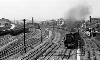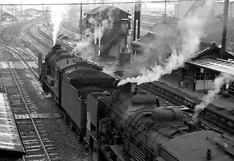 駅構内で石炭列車の先頭で発車を控える重連のキューちゃん