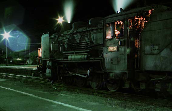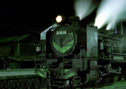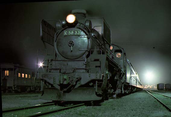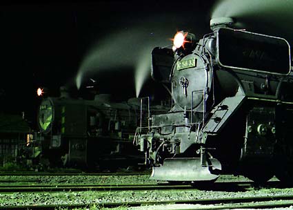 夜の蒸気機関車は幻想的な生き物に変身します。 黒く、熱く、重々しくたたずみ 水銀灯に照らし出された蒸気のベールのなかに浮かびあがるその容姿は まさに 闇に向かって 走り出そうとする 巨大な獣のよう。