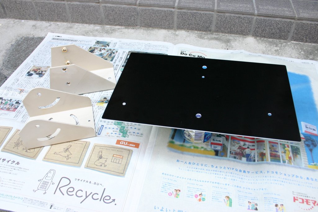 材料は職場にあったアルミの板と、仕事で設計して使い古したカメラ装置の雲台を使用する。アルミ板はプロジェクターの取り付け穴に合わせて穴を空けました。