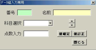 UserForm6'-------------- [UserForm6] -------------- Dim Txb As Integer 'TextBox1(出席番号) Dim r As Long 'シート最終行 Dim Fnd As Range '検索セル Dim Cln As Long 'セル行ナンバー Dim Cmb As Integer 'コンボナンバー Dim Sbn As Integer 'スクロールナンバー Private Sub ComboBox1_Change() '科目選択 If ComboBox1.Text = "" Then TextBox3.Value = "" Exit Sub End If Cmb = ComboBox1.ListIndex 'コンボリスト設定 Txb = Val(TextBox1.Value) 'TextBox1(出席番号) r = Worksheets(1).Rows.Count 'シート最終行 If TextBox1.Value <> "" Then With Worksheets(1).Range("A:A") Set Fnd = .Find(Txb, LookIn:=xlValues) '検索セル 'もし見つからなければレコード最終行の次の行 If Fnd Is Nothing Then Cells(r, 1).End(xlUp).Offset(1).Select Cln = Val(Mid(Selection.Address(), 4, 3)) Else 'もし見つかればセル行ナンバー検出 Cln = Val(Mid(Fnd.Address(), 4, 3)) End If End With '点数を TextBox3 に転記 TextBox3.Value = Range(Chr((Cmb + 64 + 3)) & Cln).Value Else TextBox3.Value = "" End If End Sub '-------------------------------------------------- Private Sub CommandButton1_Click() '値確定 If ComboBox1.Text = "" Then Exit Sub Cmb = ComboBox1.ListIndex Txb = Val(TextBox1.Value) 'TextBox1(出席番号) r = Worksheets(1).Rows.Count 'シート最終行 If TextBox1.Value <> "" Then With Worksheets(1).Range("A:A") Set Fnd = .Find(Txb, LookIn:=xlValues) '検索セル 'もし見つからなければレコード最終行の次の行 If Fnd Is Nothing Then Cells(r, 1).End(xlUp).Offset(1).Select Cln = Val(Mid(Selection.Address(), 4, 3)) Else 'もし見つかればセル行ナンバー検出 Cln = Val(Mid(Fnd.Address(), 4, 3)) End If End With '点数をシートセルに転送 If TextBox3.Value <> "" Then Range(Chr((Cmb + 67)) & Cln).Value = _ Val(TextBox3.Value) Else Range(Chr((Cmb + 67)) & Cln).Value = "" End If TextBox3.SetFocus End If '次の出席番号を TextBox1 に入れる TextBox1.Value = Range("A" & CStr(Sbn + 1)) + 1 End Sub '-------------------------------------------------- Private Sub CommandButton1_KeyUp(ByVal KeyCode As MSForms. _ ReturnInteger, ByVal Shift As Integer) 'エンターキーを TextBox3 内で押した時、 'フォーカスを CommanButton1 に行かせず 'に TextBox3 内に留めておく。 If KeyCode = 13 Then TextBox3.SetFocus End Sub '-------------------------------------------------- Private Sub CommandButton2_Click() '値訂正 If ComboBox1.Text = "" Then Exit Sub Cmb = ComboBox1.ListIndex Txb = Val(TextBox1.Value) 'TextBox1(出席番号) r = Worksheets(1).Rows.Count 'シート最終行 If TextBox1.Value <> "" Then With Worksheets(1).Range("A:A") Set Fnd = .Find(Txb, LookIn:=xlValues) '検索セル 'もし見つからなければレコード最終行の次の行 If Fnd Is Nothing Then Cells(r, 1).End(xlUp).Offset(1).Select Cln = Val(Mid(Selection.Address(), 4, 3)) Else 'もし見つかればセル行ナンバー検出 Cln = Val(Mid(Fnd.Address(), 4, 3)) End If End With 'データ消去 Range(Chr((Cmb + 67)) & Cln).Value = "" TextBox3.Value = "" TextBox3.SetFocus End If End Sub '-------------------------------------------------- Private Sub CommandButton3_Click() '閉じる Unload UserForm6 End Sub '-------------------------------------------------- Private Sub ScrollBar1_Change() 'スクロールバー値に対応するシートセルに '入っている出席番号を TextBox1 に渡す Sbn = ScrollBar1.Value TextBox1.Value = Range("A" & CStr(Sbn + 1)) End Sub '-------------------------------------------------- Private Sub TextBox1_Change() '番号の手処理にも対応 Cmb = ComboBox1.ListIndex Txb = Val(TextBox1.Value) 'TextBox1(出席番号) r = Worksheets(1).Rows.Count 'シート最終行 If TextBox1.Value <> "" Then With Worksheets(1).Range("A:A") Set Fnd = .Find(Txb, LookIn:=xlValues) '検索セル 'もし見つからなければレコード最終行の次の行 If Fnd Is Nothing Then Cells(r, 1).End(xlUp).Offset(1).Select Cln = Val(Mid(Selection.Address(), 4, 3)) Else 'もし見つかればセル行ナンバー検出 Cln = Val(Mid(Fnd.Address(), 4, 3)) End If End With 'データをボックスに転記 TextBox2.Value = Range("B" & Cln).Value If Cmb <> -1 Then TextBox3.Value = Range(Chr((Cmb + 67)) & Cln).Value Else TextBox3.Value = "" End If 'スクロールバーと TextBox1 を連動 If (Cln - 1) <= ScrollBar1.Max Then ScrollBar1.Value = (Cln - 1) '(セル行 - 1) Else Beep 'データ行数をオーバー Exit Sub End If TextBox3.SetFocus Else TextBox2.Value = "" TextBox3.Value = "" ComboBox1.ListIndex = -1 End If End Sub '-------------------------------------------------- Private Sub TextBox3_KeyDown(ByVal KeyCode As MSForms. _ ReturnInteger, ByVal Shift As Integer) 'エンターキーに対応 If KeyCode = 13 Then '値確定 If ComboBox1.Text = "" Then Exit Sub Cmb = ComboBox1.ListIndex Txb = Val(TextBox1.Value) 'TextBox1(出席番号) r = Worksheets(1).Rows.Count 'シート最終行 If TextBox1.Value <> "" Then With Worksheets(1).Range("A:A") Set Fnd = .Find(Txb, LookIn:=xlValues) '検索セル 'もし見つからなければレコード最終行の次の行 If Fnd Is Nothing Then Cells(r, 1).End(xlUp).Offset(1).Select Cln = Val(Mid(Selection.Address(), 4, 3)) Else 'もし見つかればセル行ナンバー検出 Cln = Val(Mid(Fnd.Address(), 4, 3)) End If End With '点数をシートセルに転送 If TextBox3.Value <> "" Then Range(Chr((Cmb + 67)) & Cln).Value = _ Val(TextBox3.Value) Else Range(Chr((Cmb + 67)) & Cln).Value = "" End If End If '次の出席番号を TextBox1 に入れる TextBox1.Value = Range("A" & CStr(Sbn + 1)) + 1 End If End Sub '-------------------------------------------------- Private Sub UserForm_Initialize() '初期設定 Dim kamoku As Range Dim Lr, Lc As Integer Lr = Range("A1").End(xlDown).Row 'データ最終行 Lc = Range("A1").End(xlToRight).Column 'データ最終列 '初期位置 'Me.StartUpPosition = 0 ' Me.Top = 200 ' Me.Left = 27 'コンボボックス