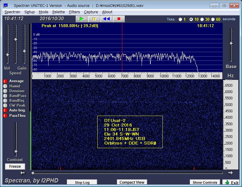 ● (No.929) DTUsat-2 テレメトリ解析 2.4GHz #4 (2016年10月30日) --------------------------------------------------------- SDR#1489 に変えてから、DTUsat-2 の信号を確認できない日々が続いていました。 29 Oct.2016, 11:06JST のパスでも信号音が聞こえませんでしたが、受信保存を してあった wavファイルを精査してみたところ、デコードできていました。大変 弱い信号だったので、自局の耳では判読不能でした。このパスでは、最近、再度 試みている Orbitron + DDE により、自動追尾(2401.845MHz) を行ってみました。 図中では、白い筋がほぼ平行に走っています。30秒ごとにこの白い筋が現れるの で、衛星からの信号に間違いありません。SDR# の Shift値を 2,256 に設定して いるので、このような Orbitron + DDE + SDR# によるドップラーシフト自動追尾 が可能になるのです。 Shift値を設定するメリットは、このようなことができる ことにあります。 30 Oct.2016, 11:19JST のパスで、Orbitron + DDE + SDR# によるリアルタイム の自動追尾で初めて DTUsat-2 の軌跡を確認しましたが、やはり、弱い信号なの で白い筋状にしか見えません。仰角がもう少しあれば、信号を解読できそうです。 <add key="fftOffset" value="-50.0" /> in SDRSharp.exe.Config![]()