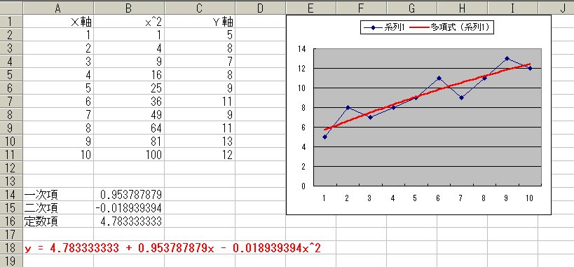 bottom top Excel VBA による方法 ---------------------- 次のコードは、下記URL を参考にした。このコードを実行すると、上図1の データ行の下の行のセル範囲 A14〜B16 に、一次項・二次項と定数項の値を 算出する。 Private Sub test1() Dim matX As Variant Dim matY As Variant Dim matC As Variant Dim Dn As Long Dim Lr As Long Dim Ri As Long 'データ設定 With Sheet1 Lr = .Range("A1").End(xlDown).Row matX = .Range("A2:A" & Lr).Value matY = .Range("C2:C" & Lr).Value End With Dn = Lr - 1 '二次項・定数項の設定 ReDim Preserve matX(1 To Dn, 1 To 3) For Ri = 1 To Dn matX(Ri, 2) = matX(Ri, 1) * matX(Ri, 1) matX(Ri, 3) = 1 Next '関数 matC = CalcCoefficients(matX, matY) '出力 With Sheet1 .Range("B14:B16").Value = matC .Range("A14").Value = "一次項" .Range("A15").Value = "二次項" .Range("A16").Value = "定数項" End With End Sub '回帰計算の定義関数 Function CalcCoefficients(matX As Variant, _ matY As Variant) As Variant Dim mat1 As Variant Dim mat2 As Variant Dim mat3 As Variant Dim mat4 As Variant Dim mat5 As Variant '回帰計算 With WorksheetFunction mat1 = .Transpose(matX) '転置行列 mat2 = .MMult(mat1, matX) '行列の積 mat3 = .MMult(mat1, matY) '行列の積 mat4 = .MInverse(mat2) '逆行列 mat5 = .MMult(mat4, mat3) '行列の積 End With CalcCoefficients = mat5 End Function この結果、回帰曲線(近似曲線) は、次の通り求まる。 y = 4.783333333 + 0.953787879x - 0.018939394x^2 ----------------------------------------------------- (補足) 回帰分析により 近似曲線(近似直線) の係数を求めるための統計学的 な条件として、n個の正規母集団からの任意標本 (x1, y1), (x2, y2), ... ... (xn, yn) を抽出したときに、個々の正規分布に従う確率変数 Yi の標本 値 yi の平均が、この曲線(直線)上にあると仮定している。 また、分散は各 正規分布について同一であると仮定している。 《参考書籍》 統計数学入門 (数学ライブラリー18) 本間鶴千代著, 森北出版 《参考URL》 MOUG(モーグ) Microsoft Office Users Group Q&A 掲示板 http://www2.moug.net/cgi-bin/mdboard.cgi?exvba+ID0001 back top