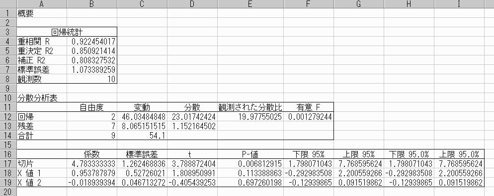 前問では 回帰直線(近似直線) を求めた。本問では、次図C列の 10個の実験 データ(Y軸)から、回帰曲線(近似曲線) y=a+bx+cx^2 を求めることを考え る。 B列に新たに x^2 の列を挿入している。 前問と同様、事前に Excel 上 で、[ツール] - [アドイン] をクリックし、「分析ツール」「分析ツール - VBA」 の二ヶ所にチェックを入れて、'Microsoft Office 2000' の CD-ROM からインストールしておく。 図1bottom top Excel のアドイン機能による方法 --------------------------------- Excel - [ツール] - [分析ツール] - [回帰分析] とクリックして選択する。 次に、[入力元] の 「入力Y範囲」 で 上図の C列のY軸データを選択し、 「入力X範囲」 で A列のX軸データとB列を一緒にドラッグし選択すると 新規シートに次の表が自動的に追加される。 図2に見える 切片 の係数が 回帰曲線 y=a+bx+cx^2 の定数項 a で、X値1 の係数が 一次項 b、また X値2 の係数が 二次項 c である。 図2
