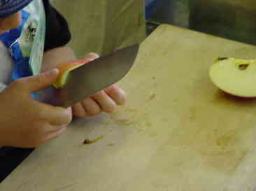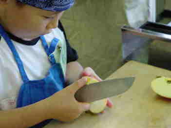 りんごの皮むきを包丁でするのが初めての子も、多かったです。 |