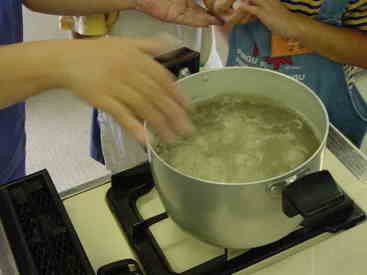 沸騰したお湯に入れ、浮き上がってきたら出来上がりです。 |