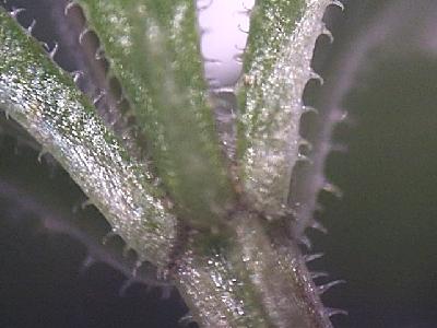 ヤエムグラの仲間は,茎や葉に,こまかい毛が生えています。「毛」と言うよりも,「とげ」と言ったほうがいいくらい,しっかりしたものです。この毛が,マジックテープのような役割をしてくれるのです。