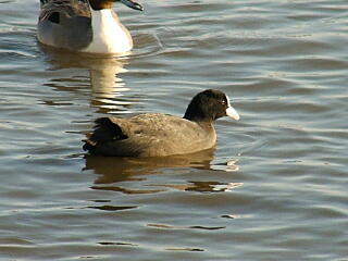 オナガガモ。餌を撒くといちばん先に人に慣れてしまうカモです。このカモが増えると,コガモが追い出されてしまったりするんで,人があんまりカモの生態を変えてしまわないようにしたいので,私はあんまり餌付けを好みません。