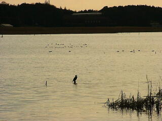 暮れかかる手賀沼にたたずむのはカワウ。その奥にはカモの群れがいます。