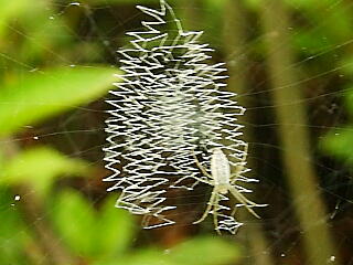 (ナガコガネグモは,幼体のときだけ,ギザギザの隠れ網を作ります))