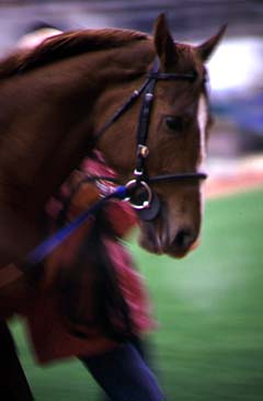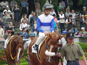 前回同様気合が入った状態での登場。絶え間なく調教 を積んでいるのに8kg増となってしまった。 返し馬の様子からみると道悪はあまり得意ではないみた いだ。 ロードアックスに逃げに全然ついて行けず中段からやや 後方を進み,徐々に追い上げるも最後の坂で伸びず7着。 左の写真はかなり気に入っています。 |