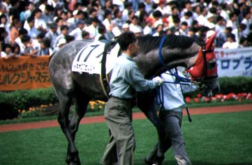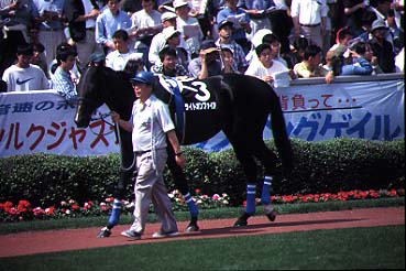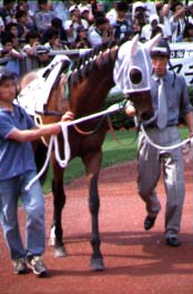 本日の大本命メジロブライトとランニングゲイルの登場。ブライトは入れ込み気味でしたが馬体は文句なし | |