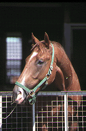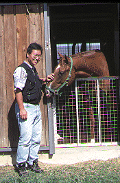 左はいっしょに行った山下君とブルーラグーンのスナップ。 (俺の方がスナップが多いのに写りが悪い) この馬はおとなしいとのことで鼻面をなでたり草を直接手から食べさせ たりと楽しい時間を過ごしました。 草を食べたのが久しぶりだったみたいで,脚でかいて「くれ」と要求し たり厩舎に入った後は首を上下に振って要求したりとまだまだ幼いと ころも見せていました。 こんなにおとなしいのがいけないのか根性がないのか美浦に入厩した らみっちり鍛えてもらって早く勝利の美酒を味わせておくれ。 | |