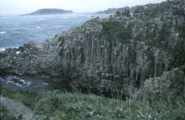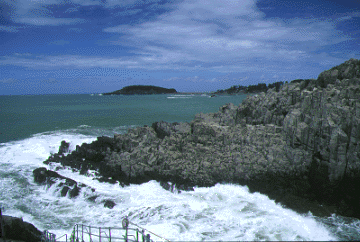 | 9/25(土) | 東尋坊 | 昨日は台風が接近しているということで付近の土産物屋もほとんどがしまっていた。今日は空も青く、観光客も多い。昨日は風が強くて体を支えるものがないとカメラも構えられなかったのに、今日は楽勝。でも、波は今日の方が高い。 | ![]() |