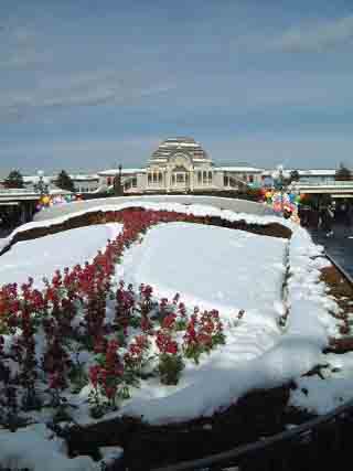 | ワールドバザールを背に駅を。 雪でお花がかわいそう? |