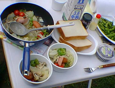 | まんじりともせず、夜が明けはじめてしまいました。 仕方ないので、薄暗いなかを起きて、むすめらの散歩を・・・・・ でも、明け方に飲んだ、カフェオレは美味しかったなあ〜 明るくなってから、涼しいうちに朝御飯! メニューはね ・野菜とフランクフルトのスープ ・チーズとハムのホットサンド アルミ箔でチーズとハムをはさんだパンをくるんで炭火で焼いた だけだったけど、美味しかった〜。来る途中で買った生の ブルーベリーも美味! ターフの中ではなんとなく勿体なかったので、外にテーブルを だして川を眺めつつたべました。 |