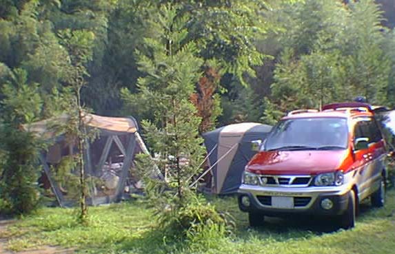 ![]() テントとターフとノア三 隣のサイトとは何本かの小さい杉の木で 区切られています。 川は奥のほう |