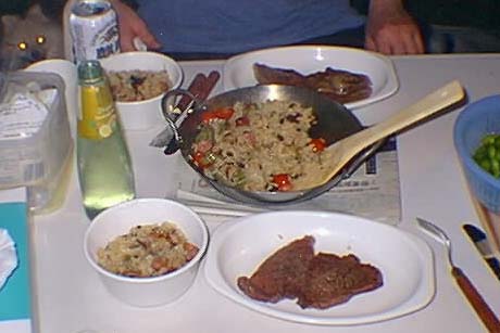 ![]() パエリアもどきの入っている鍋は100円。 お焦げができたけど、おいしかったぞ。 お肉も網焼きって美味しい! |