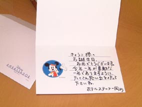 | ベルマンのお兄さんが部屋を開けてくれた。目の前に広がったのはとっても明るい部屋。うれしくって速攻で窓を開けていた。窓を開けて見えたのはアンバサダーの中庭。右手にはイクスピアリ、そして正面奥にはシンデレラ城とビックサンダーマウンテンの山が見えた。信じられない。 絶対に駐車場とか京葉線とかしか見えない部屋だと思ったのにーちっちゃいながらもベランダがついてるじゃないですか。ベルのお兄さんがいろいろ説明をしてくれるんだけど、私としては 「早く騒ぎたい〜」なので気もそぞろだったですよ。 ベルのお兄さんが部屋から出ていったとたんに思わず叫んでしまいました。ベランダの窓を開けてベランダに出て、そこら中をのぞき込んで写真を撮って。舞いあがってしまいました。 ふと、落ち着いて窓際のテーブルの上に小さいアンバサダーの封筒が。開けてみるとアンバサダースタッフの方々からのバースデーカードでした。うれしー。もし、皆さんが誕生日にお泊りすることがあったら、予約の際に誕生日だと申告することをおすすめします。 |