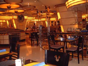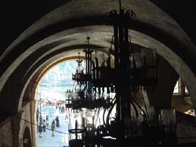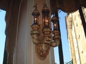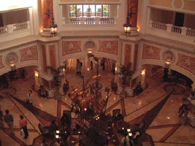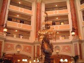 シー入り口近くにある、これまたコージャスな電気というかランプというか。。。 | 上からロビーを撮ってみた。帆船のまわりはソファーなんだけど、皆上を見てる。 |