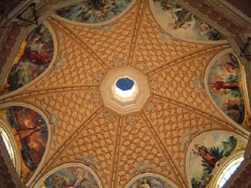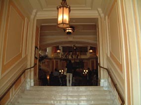 ロビーの天井画。それぞれのテーマポートの絵なんですが、ヒドゥンミッキーを探して正味1時間以上上を眺めていましたわ。 | ロビーからこの階段をおりて、宿泊者用のTDSのゲートに向かいます。 |