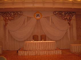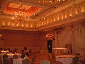 | 宴会場へ行く廊下。そいえばなんかの雑誌の表紙もこんな写真だったけ。 | 宴会場の高砂。ここは人前式だから仲人の席がないのかしら。 | 模擬宴会場。何組かが相談に来てました。 お幸せに。 |