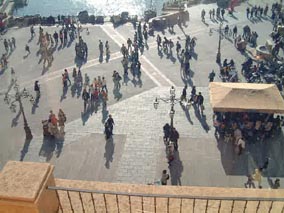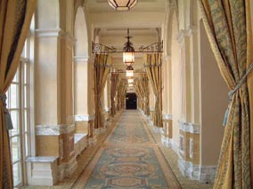 | アンバサダーのベルのお兄さんに見送られて車で一路ミラコスタへ。 一月前に宿泊確認書が来てその中にホテルのパンフレットとミラコスタについては『通交証』なる物が入っていたのでそれを一応確認する。ホテルの入り口に一応門番?の人がいたので、緊張するけど「宿泊でーす」って言ったらすぐ通れた。坂を登って正面玄関に車をつけると、あいや〜とおってもゴージャスな玄関からゴージャスなホテルの人がお出迎え。うやうやしくドアまで開けてもらっちゃって、かえで感激。荷物を降ろしたらなんとバレーパーキングだと言うじゃあありませんか。車を係りの人に持っていってもらうなんて待遇は私達ははじめてざんすよ。緊張と興奮の嵐です。(そのため、写真を撮るどころではありませんでした。。。。。。) 「お荷物はおひとつとお召し物2点でよろしいですね。」パークに行っているチェックインまでの間荷物を預かってもらったんだけど、そんなお召し物なんていうほどのものじゃあ、ありません。ごめんなさい着倒したフリースとコートなんですから。。。。。。 玄関からホテルに入って、きっと私の口は『ぽか〜ん』と開いていたことでしょう。まあ、なんつうか、ゴージャスなホテルです。今までに見たどのホテルよりもゴージャスです。思ったよりロビーは広くはなかったですが、5階までの拭きぬけに、吹き抜けにある天井画。キャストさんの衣装。カウンターにトイレの蛇口。どれをとっても凝っております。なんだかぞくぞくしてきちゃいました。 |