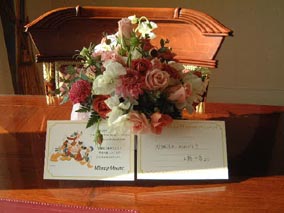 | だれもいないホテルの中庭をちょっとぶらぶらした。部屋にもどったら電話のメッセージランプがついていた。なんだろうなあと聞いてみると「やあ、今日は何の日か知ってるかい?君の誕生日だよ。今年一年がすばらしいと詞であるといいね・・・・・・」な〜んとミッキーからのバースデーメッセージだったですよ。びっくりざんす。誕生日に世界のスーパースターからメッセージもらえるなんてすてきだ〜 ちょっとホテルでゆっくりすることにした。やはりお部屋を堪能しないとね〜 エクスプレスチェックアウトの手続きをしていたので、別にフロントに行く必要もないので、楽ちん。明細は後日ちゃんと自宅に届いてました。 とらが車を駐車場に取りに行っている間に2Dayパスポートを買いました。1日券はマジックキングダムクラブの割引がきくけど、2Dayパスポートからは割り引きはないんだって。 |