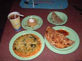 | セバスチャンのカリプソキッチンで。 チーズピザとフォカッチャ、チキンと プリン。バナナのピザもあったよ〜 |