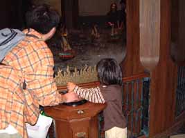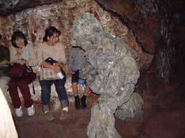 | そろそろ、時間もいいかなあ。と思いお城を出かけるとどれみさん達と合流。しかしみーさん達がいないので、待ち合わせ場所のセンターオブジアースの出口に行ってみる。そこで、みょうな物体に遭遇。下の写真の「岩男」である。こやつはなにものなんだかわからないけど、けっこういけている!キャストさんがしきりに「写真はいいけど、さわらないでね」と言っていた。岩男は肌がよわいらしい。 みーさん達がいなかったので、いーよーさんに電話をしていると、後ろにいたとらが、呼んでいる。振り向くと、かわいい女の子と一緒。一瞬?おお!akicocoさんではないですか!偶然遭遇したらしい。よくぞうちのとらを覚えていてくださった! |