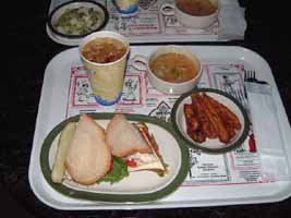 | 熟睡して5時半。外はけっこう寒くなっていたので、それぞれもう一枚着こむ。 夕飯として、どうしても食べたかった『アメリカンウィーターフロント』の「ニューヨークデリ」に行く。途中ミラコスタの裏?ゴンドラの通る所ら辺を散歩。いい感じじゃないですか! 「ニューヨークデリ」ではとらがコンビーフサンド。かえではなんだったっけ?あとスイートポテトフライとスープを頼んだ。サンドウィッチには大きなピクルスが!大きなピクルスは前から聞いていたので、丸まま出てくるのかと期待してたんだけど、四分の一だった。サンドウィッチは具がたっぷりでおいしい!スイートポテトフライはすこしシナモンの香りがして好き。 |