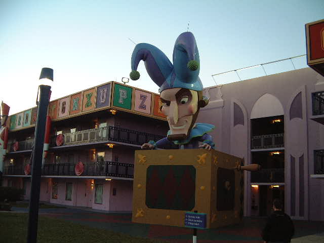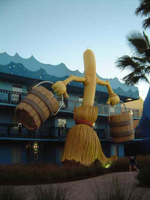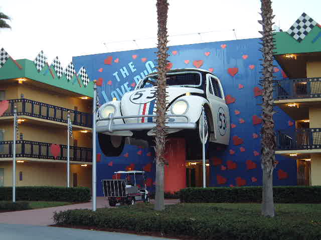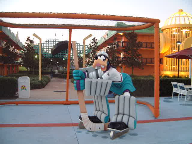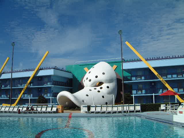 6:00に起きる。今日はUSFに行く予定なのだ。初日に1day2parkチケットはもらっていて、8:40にロビーに迎えに来てくれることになっている。ちょっとゆっくりなのでとらはまだ寝てるというので、かえで一人でちょっとホテルを散策することにした。101棟を奥に進むと、マイティーダックス棟との間に小さめのプールがあった。プールがアイスホッケーのリンクになっていて、ゴールキーパーにはグーフィーが。向かいのゴールはシャワーになってたし、ロッカールームはランドリーと更衣室になってた。マイティー棟の裏をぐるっと回ってラブ・パグ棟へ。かわいい車が、でもこの映画しらないんだよなあ。。そこを抜けると、ファンタジア棟へ。いやはやかわいい。かわいいけどちょっと怖い。 ファンタジア棟の前にはファンタジアプールが。プールの正面にはファンタジアのミッキーがいる。朝は出てないんだけど昼間はミッキーの指のあたりから水が飛び出てくる。みっきーの向かいにはフロント棟。ミッキーを背にして右手に氷山のオブジェがあってそこはランドリーになってる。ランドリー棟を右手に行けばトイスト棟がある。でも結局トイスト棟には行かずじまいだったの。 |