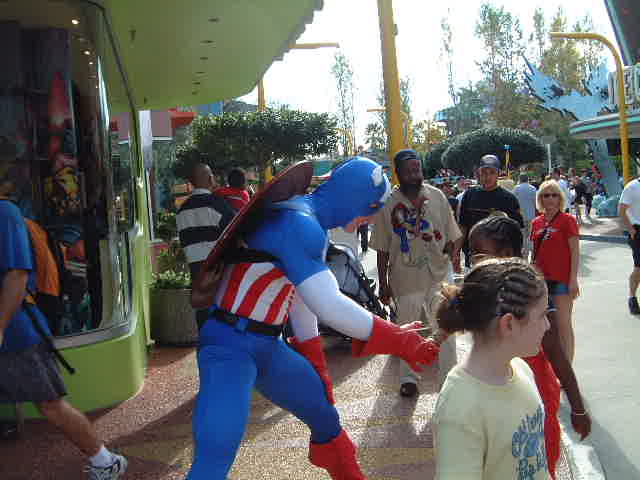 | もう3:00過ぎていた。お腹もすいていたし、ちょっと疲れたので自由時間を提案し、T氏とわかれてご飯を食べに行った。 チキンシーザーサラダ 7.69j フライドチキン3P 7.69j ゲータレード 2.89j 30数年生きていて、レタスでお腹をいっぱいにしたのは初めてだった。ゲータレードの色は水色。。。。。。 アメコミ屋さんでとらがお土産を買っている間、デュエルドラゴンの後遺症でへろへろ気味のかえでが外のベンチで休んでいると、向こうから車のクラクション音が。見ると、スパイダーマンやら、Xマンやらアメコミのヒーロー達が四輪バギーに旗を立てて列を組んでこっちにくる。アメコミ暴走族だ。先頭のヒーローだか、悪役だかわからない人が巨大な水鉄砲でゲストに水をひっかけまくっていた。アメコミの人って、ヒーローなのか悪役なのかわかりずらいなあ。 T氏と再び合流し、やっぱり「スパイダーマン」は見ておきましょうということで、並ぶ。ここはトヨタが提供。列も長かったが、並んだだけはあった。ライドと3Dの見事な合体。これは早めに大阪に出来てもらうことを希望するね。 |