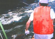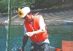 今年は水量が少ない為船底が引っかかってしまい筏を降り押すはめになる。