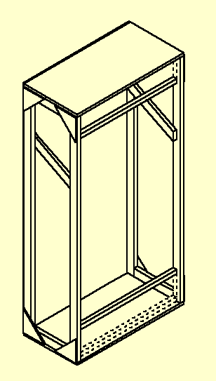 背板が貼れたら、天井と底板の ひずみ止めを取り付けます。 長めの木ねじ (またはタッピングスクリュー)で固定。 これも10cm間隔くらい。