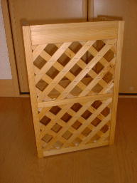 最後に,小さなラティスを作って感じたことを述べさせてもらいます。フェンスぐらいの大きさのラティスを自分で作るには,材料を集めるのが大変だということです。おそらく,ホームセンターなどで売られているラティスは2×4材の製材などで出る端材をうまく利用して作っているのだと思います。そのため,値段もそんなに高くは感じません。これを自分で作るとなると,ある程度の施設が無いと,難しいと思います。大物ではなくて,ちょっと変わったデザインの小作品を作ってみたいと思う向きには,ラティスを利用してみると,外で使う小物などにはマッチするかもしれません。