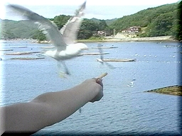 船のデッキよりウミドリに「かっぱえびせん」をあげているところ。