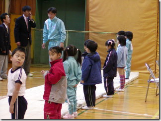 最初の種目「跳び箱」の順番を待つ千佳(一番手前)