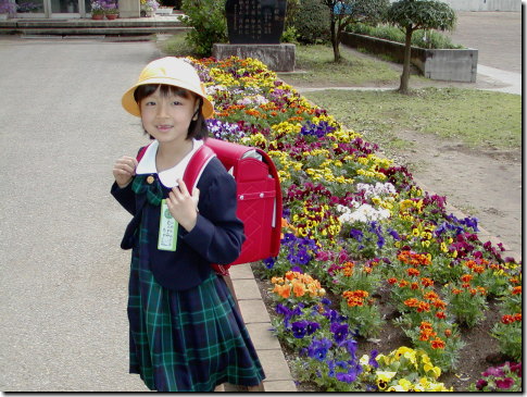入学式を終えて花壇の前で記念写真