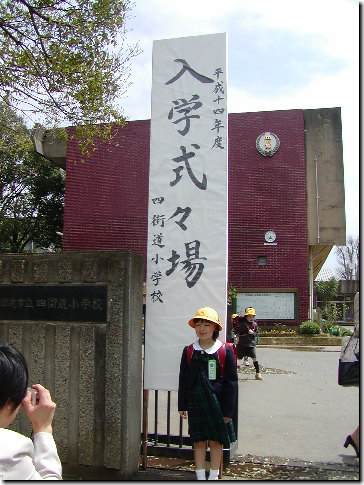 学校の正門の前で記念写真