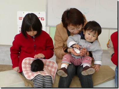 ・子供動物コーナーで「ハツカネズミ」を撫でている恵太