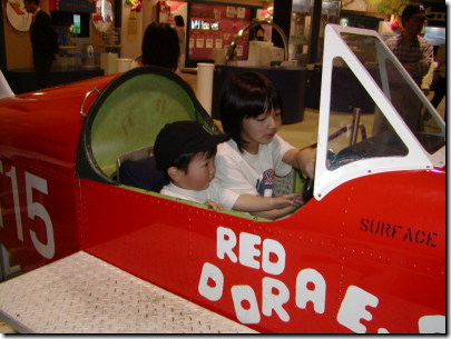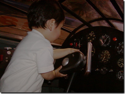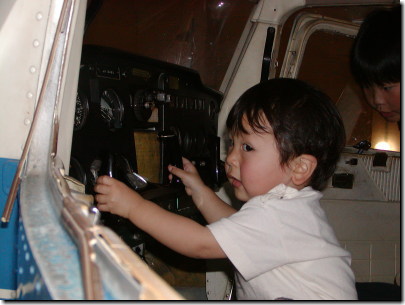 館内に展示されている飛行機の操縦席でパイロット気分を味わう恵太
