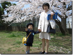 さつき幼稚園には桜の木がないので近くの小学校の満開の桜の下で記念写真