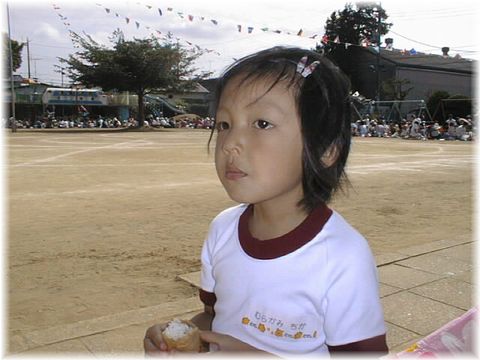 午前の部を終え、楽しみなお弁当の時間の一コマ。 (大好きな「おいなりさん」を食べている千佳) |