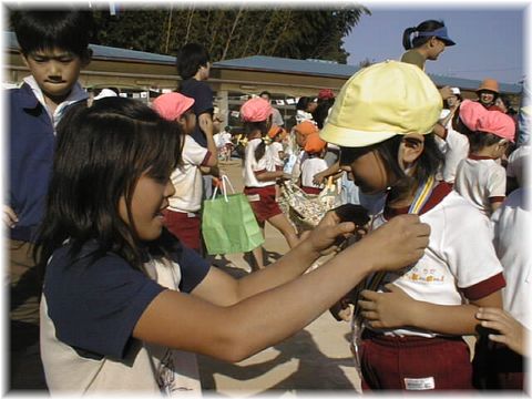 玉入れの結果を待つ園児。年少組が優勝しました。 (左から2番目が千佳) |