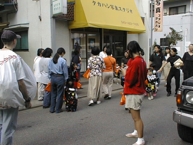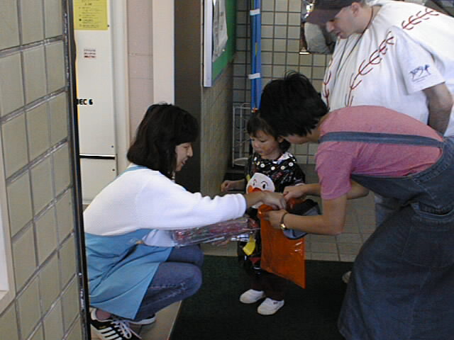 後ろで野球ボールの仮装をしているのは教室の外人先生。