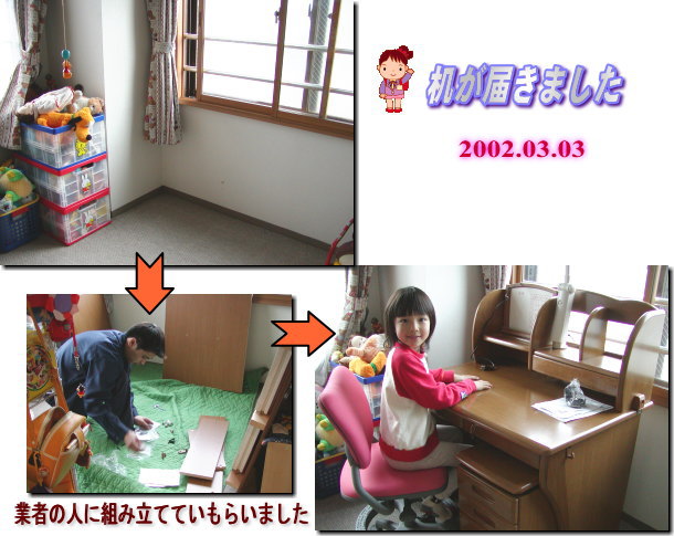 雛祭りの今日、待ちに待った机が届きました。ちょっとお部屋がせまくなったけどとっても嬉しいです。イスもくるくる廻るのでおもしろいよ。小学校に入学したらいっぱい勉強しま〜す? これから入学までに文房具類を準備して机の中を整理する予定です。 | |